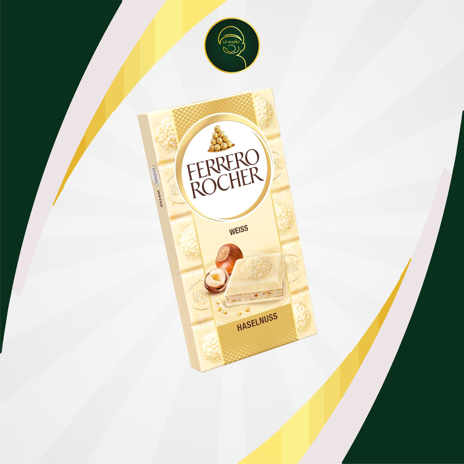 Ferrero Rocher Weiss is a white chocolate bar that features a rich white chocolate exterior surrounding a creamy hazelnut filling and crunchy hazelnut pieces, inspired by the iconic Ferrero Rocher chocolate. The bar offers a refined taste experience with contrasting textures and is a luxurious treat for white chocolate and hazelnut lovers.