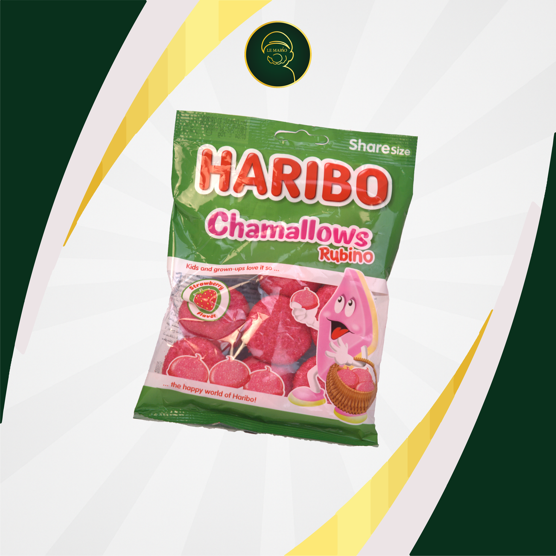 Haribo Rubino are soft, melting marshmallow balls covered with a light layer of red sugar. Ideal for candy cakes! Sugar, glucose syrup, water, humectant (sorbitol syrup), gelatin, fruit and plant concentrates (carrot, radish), natural flavor.