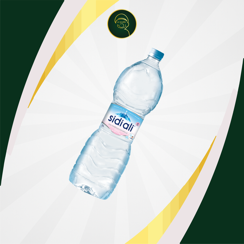 Sidi Ali is a brand of natural mineral water sourced from the Bassin d'Oulmès and Sidi Ali Cherif regions in Morocco. The "2L" indicates a 2-liter packaging size for their bottled water, which falls under the categories of beverages, spring waters, and natural mineral waters.