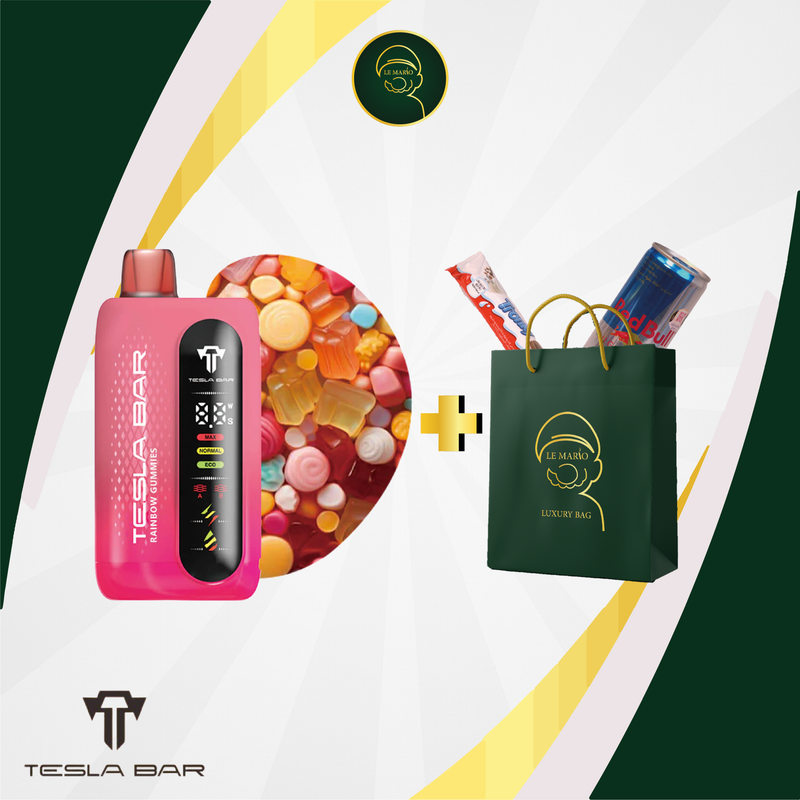 Taste the rainbow in every puff with the Tesla Bar XT 23,000 Puffs Rainbow Gummies. This premium disposable e-cigarette blends a mix of fruity candy flavors, delivering a sweet, playful, and refreshing vape that lasts for weeks. • 🌬️ 23,000 Puffs – extra-long-lasting performance • 🌈🍬 Flavor: Fruity Candy Gummies • ✅ Nicotine Strength: 5% (50mg) – smooth, satisfying throat hit • 🔋 Rechargeable USB-C battery for reliable power • 🛡️ Sleek, portable, and leak-proof design Perfect for vapers who love sweet, candy-inspired fruity flavors in a premium, high-capacity device.